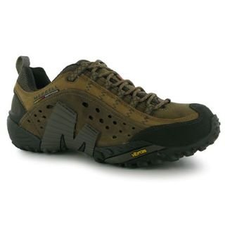 The Merrell Intercept Mens Walking Shoes are ideal for facing a range of terrains featuring a low cut molded construction to keep your feel covered wherever you go. These Mens walking shoes are constructed with a hardwearing Vibram sole unit with a deep 4.5 grip for traction along rocky and uneven trails coupled with an abrasion resistant rubber toe bumper for added durability finishing off with a shock absorbing air cushion to the heel, along with an EVA foot frame and nylon arch shank helping support the foot for comfort. Mens walking shoes Strobel construction Full grain leather upper Bellows tongue Abrasion resistant toe cap Breathable mesh lining Aegis antimicrobial solution Ortholite anatomical footbed Moulded nylon arch shank Inboard compression molded Eva foot frame Air cushion to the heel Vibram axis sole Synthetic leather textile upper, Textile inner, Synthetic sole